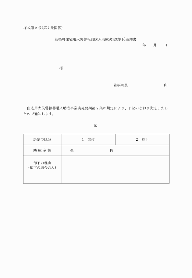第6条 助成金の交付を受けようとする者は、警報器の取付けを行った後、速やかに若桜町住宅用火災警報器購入助成金交付申請書(様式第1号)に次に掲げる書類を添付して、町長に申請しなければならない。