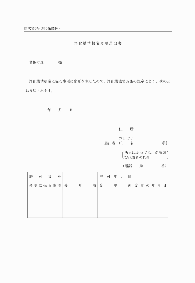 第8条 浄化槽清掃業者は、許可証をき損し、汚損し、又は亡失したときは、町長に許可証の再交付を申請することができる。