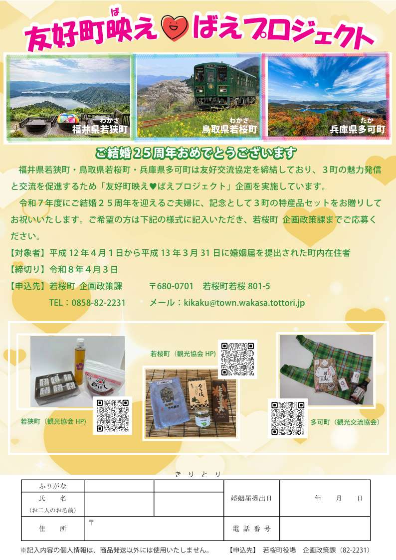 令和7年度は、本年度にご結婚されたご夫婦、金婚・銀婚を迎えたご夫婦に、記念として友好町3町の特産品セットをお贈りしてお祝いいたします。特産品セットをご希望の方は、必要事項を記入のうえご応募ください。