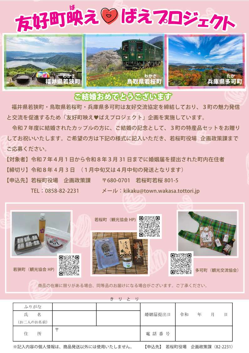 鳥取県若桜町・福井県若狭町・兵庫県多可町の3町では、友好協定を締結し、3町の魅力をPRするため、「友好町映えばえプロジェクト」としてさまざまな企画を検討しています。